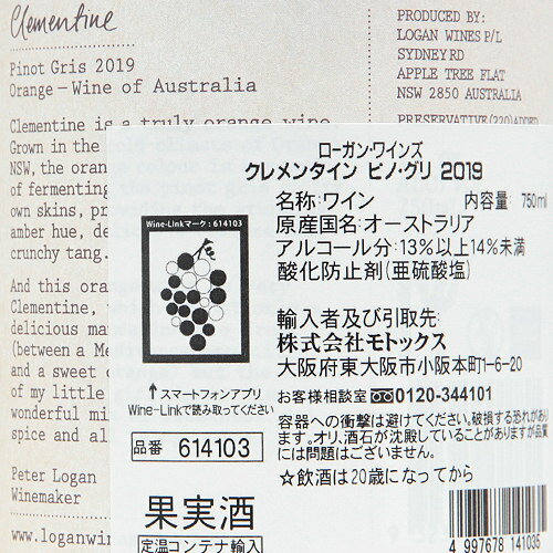 クレメンタイン ピノ グリ 2019 ローガン ワインズ Clementine Pinot Gris Logan Wines 白ワイン オレンジワイン オーストラリア ニューサウスウェールズ オレンジ地区 モトックス