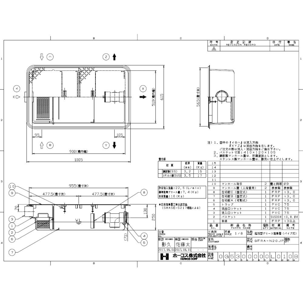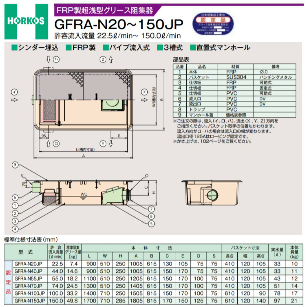 HORKOS FRP製超浅型グリース阻集器 シンダー埋込 パイプ流入式 3槽式 直置式マンホール ■GFRA-N20JP+S 本体 FRP バスケット SUS304 パンチングメタル マンホール蓋 ステンレス(T-0 人荷重) ※ご注文の際は、流入方向(イ・ロ・ハ)、流出(X・Y・Z)方向をご指示ください。