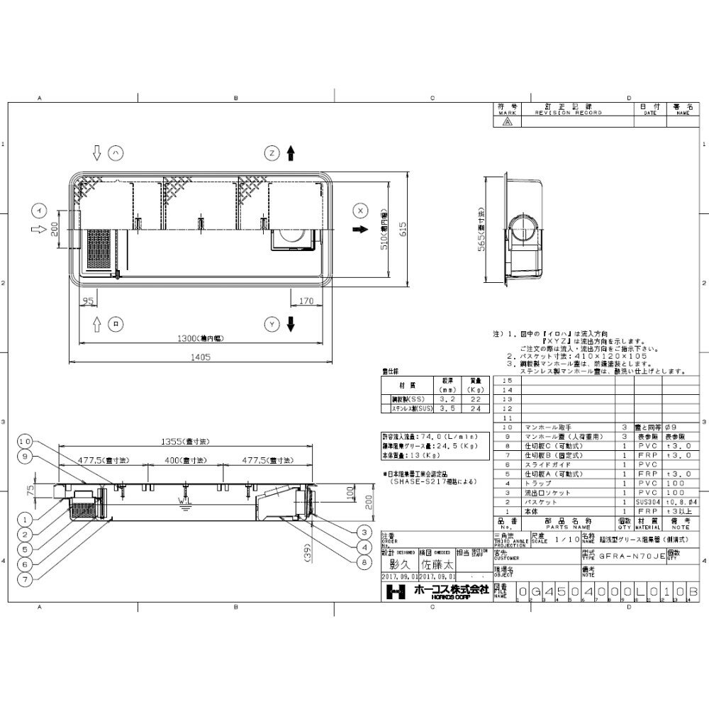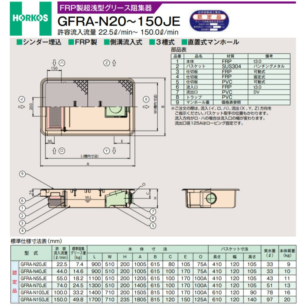 HORKOS FRP製超浅型グリース阻集器 シンダー埋込 側溝流入式 3槽式 直置式マンホール ■GFRA-N70JE+S 本体 FRP バスケット SUS304 パンチングメタル マンホール蓋 ステンレス(T-0 人荷重) ※ご注文の際は、流入(イ・ロ・ハ)、流出(X・Y・Z)方向をご指示ください。
